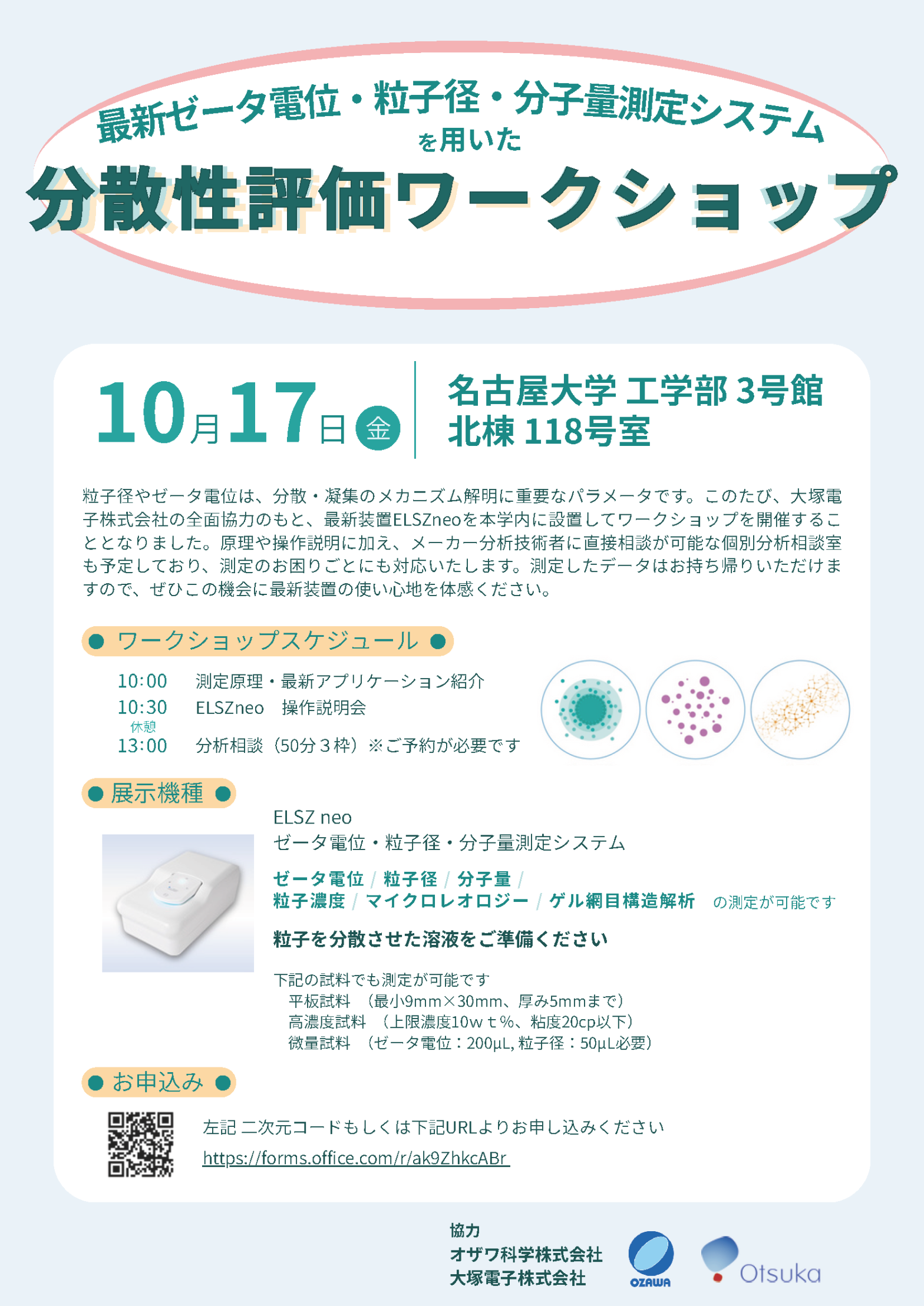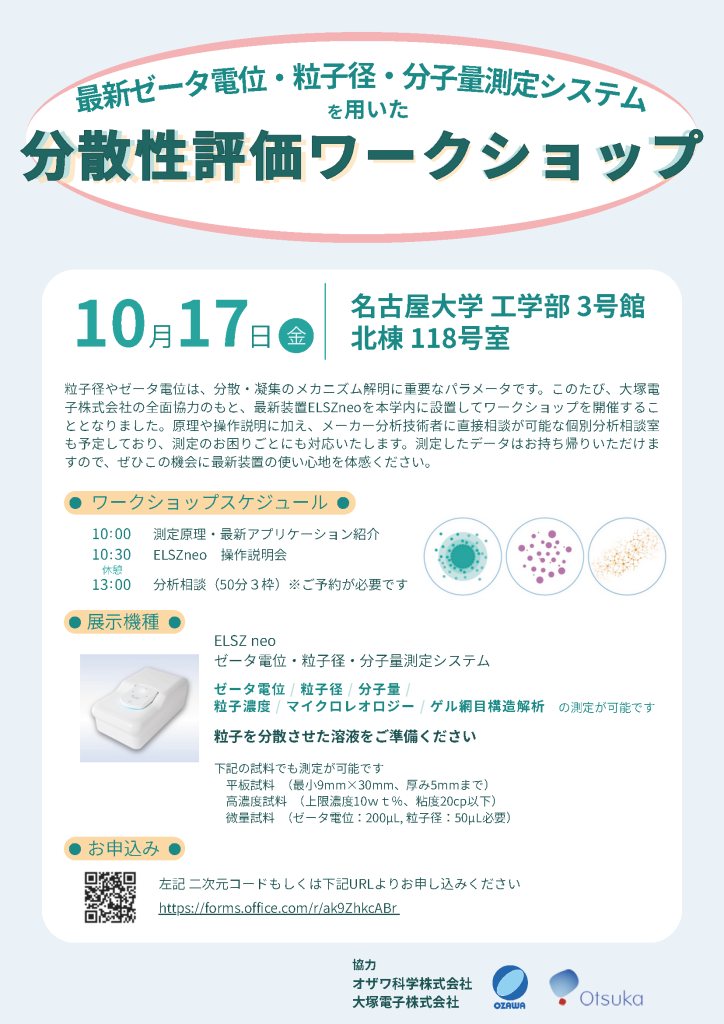 【お知らせ】分散性評価ワークショップの開催について 【お知らせ】分散性評価ワークショップの開催について この度、大塚電子株式会社にご協力いただき、最新の【ゼータ電位・粒子径・分子量測定システムELSZneo】を2週間設置することとなりました。くわしくは、下記のチラシをご参照ください。 【問い合わせ先】 国立大学法人 東海国立大学 統括技術センター 広報担当 松浦 彩夏 cfa[at]tech.thers.ac.jp ※[at]を@に変えてご使用ください